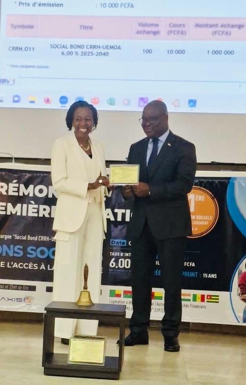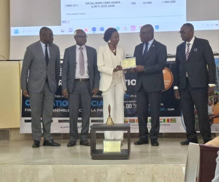 La BRVM a procédé ce mercredi 3 septembre 2025 à la cotation de l’emprunt obligataire de la Caisse Régional de Refinancement Hypothécaire (CRRH-UEMOA) dénommé « Social Bond CRRH-UEMOA 6% 2025–2040 » d’un montant de 60 milliards FCFA.